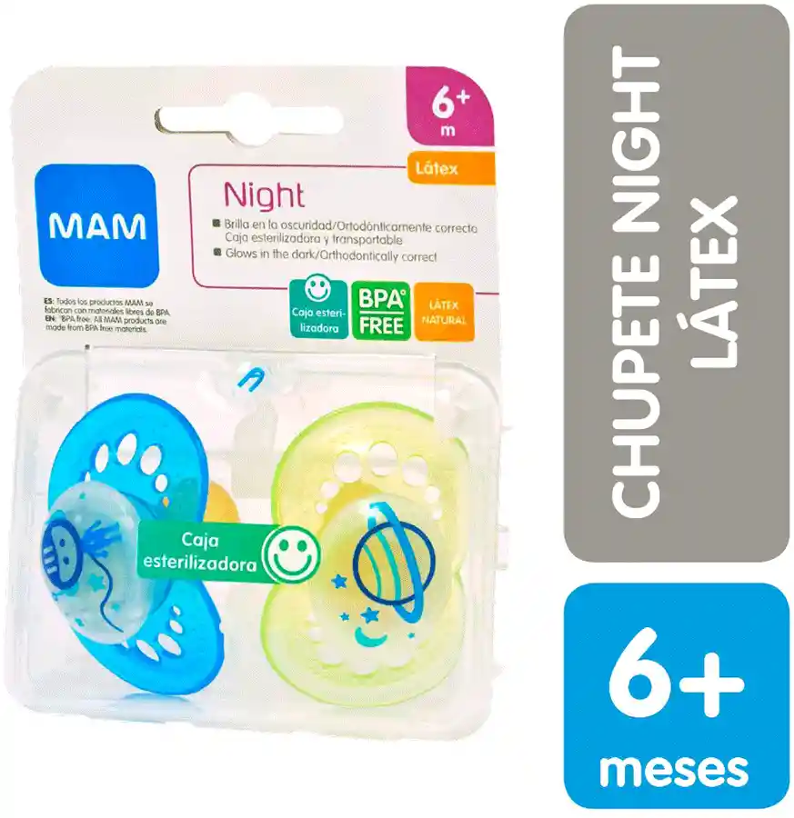 Tetina de látex natural de alta calidad que proporciona una sensación de comodidad al succionar. Agradable para la piel gracias a sus orificios y exclusiva forma curva. Incluye una caja para esterilizar los chupetes en el microondas y también se puede usar para transportarlos en tu cartera.