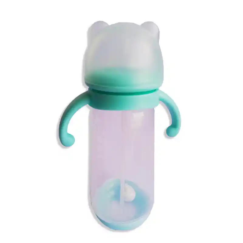 Características: Biberón de autoalimentación para bebé. No es necesario que las madres sostenga el biberón ya que la bombilla regula el flujo. Es portátil, ligero, fácil de llevar y sostener. La botella tiene un mango que facilita el agarre para los bebés Especificaciones: Material: Plástico + Silicona (Libre de BPA). Color: Transparente + Calipso (Según Disponibilidad) Género: Niña / Niño Medida: 420 ML equivalente a 15 Onzas. Contenido: 1 Mamadera con Bombilla. ______________________________