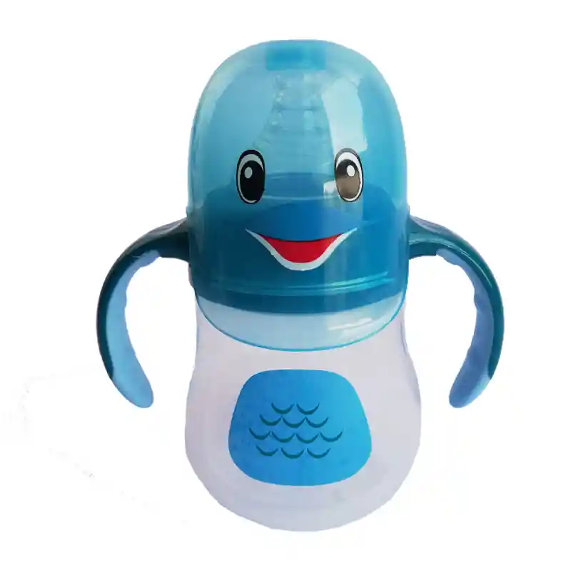 Material: Plástico (Libre de BPA) + Silicona Medida: 210 ML Equivalente a 7 onzas Medida Agujero: 3 Meses en Adelante. Diseño: Celeste (Delfín) Contiene: 1 Mamadera. Con un Lindo Diseño para que los minutos de alimentación sea más divertido Su tetina de silicona está diseñada para ayudar a tu hijo a beber de forma independiente. Asas dobles, comodidad para que el bebé lo sostenga. Portátil, ligero, fácil de llevar y sostener.