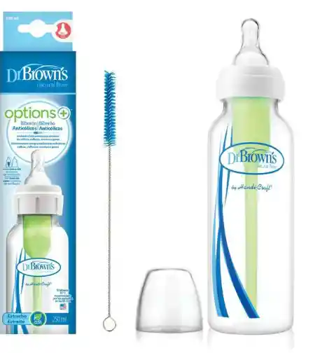 Mamadera Estándar Options 250ml Dr. Brown's Características: 1 mamadera estándar 250ml. Tetina suave de silicona para 0M+. Cepillito de limpieza (para tubo interior). Características Alimentación sin vacío, similar al pecho materno. El bebé sólo toma leche y no aire. Reduce en forma efectiva los cólicos, - vómitos, eructos y gases. Ayuda a tranquilizar al bebé. Se puede retirar el Sistema de Ventilación, cuando el bebé ya no presenta problemas estomacales. Preserva vitaminas C, A & E + lípidos. El sistema minimiza la oxidación de la leche. Apta para el la