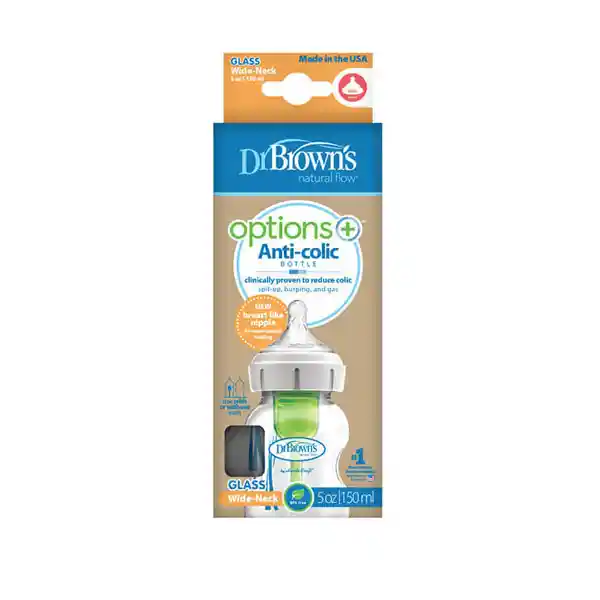 Incluye • 1 mamadera boca ancha vidrio 150ml. • Tetina suave de silicona en forma del pezón de la madre 0M+. • Cepillito de limpieza (para tubo interior). Ventajas • Alimentación sin vacío, similar al pecho materno. • El bebé sólo toma leche y no aire. • Reduce en forma efectiva los cólicos, vómitos, eructos y gases. • Ayuda a tranquilizar al bebé. • Se puede retirar el Sistema de Ventilación, cuando el bebé ya no presenta problemas estomacales. • Preserva vitaminas C, A & E + lípidos. • El sistema minimiza la oxidación de la leche. • Apta para el lavavajillas (parte superior). • Sin BPA. Niveles de Tetinas Disponibles • Prematuro, 0M+, 3M+, 6M+, 9M+ y 9M+ Corte Y (líquidos más espesos). Consejo • Mezclar en un vaso la leche en polvo y el agua, revuelva hasta eliminar las burbujas y espuma, luego vacíe la fórmula en la mamadera Dr. Brown’s. No agitar la mamadera en la preparación.