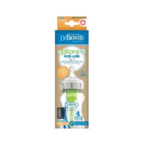 Incluye • 1 mamadera boca ancha vidrio 270ml. • Tetina suave de silicona en forma del pezón de la madre 0M+. • Cepillito de limpieza (para tubo interior). Ventajas • Alimentación sin vacío, similar al pecho materno. • El bebé sólo toma leche y no aire. • Reduce en forma efectiva los cólicos, vómitos, eructos y gases. • Ayuda a tranquilizar al bebé. • Se puede retirar el Sistema de Ventilación, cuando el bebé ya no presenta problemas estomacales. • Preserva vitaminas C, A & E + lípidos. • El sistema minimiza la oxidación de la leche. • Apta para el lavavajillas (parte superior). • Sin BPA. Niveles de Tetinas Disponibles • Prematuro, 0M+, 3M+, 6M+, 9M+ y 9M+ Corte Y (líquidos más espesos). Consejo • Mezclar en un vaso la leche en polvo y el agua, revuelva hasta eliminar las burbujas y espuma, luego vacíe la fórmula en la mamadera Dr. Brown’s. No agitar la mamadera en la preparación.