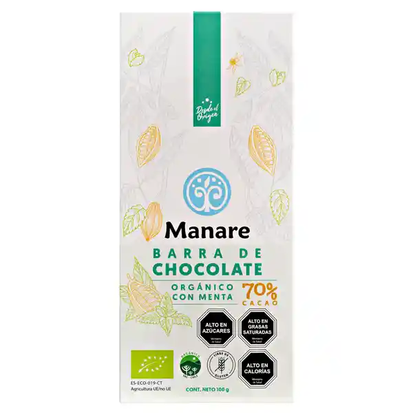 Delicioso Chocolate Orgánico Saborizado Con Hojas de Menta Orgánica. Excelente Alternativa Par Quienes Quieren Comer un Chocolate Más Saludable ya Que Tiene 70% Cacao y Está Endulzado Con Azúcar de Caña Orgánica.