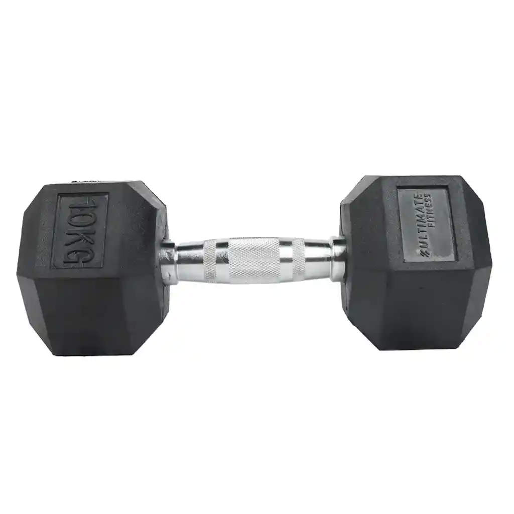 Las mancuernas son la manera más simple de iniciar el entrenamiento deportivo o de trasladar las rutinas de manera fácil al hogar gracias a su tamaño y simpleza. A diferencia de las máquinas de ejercicio, donde los saltos entre carga son más grandes, las mancuernas nos permiten progresar de manera paulatina según nuestra necesidad. Al no existir una ruta predefinida para realizar el movimiento como en las máquinas somos sumamente conscientes al realizar el ejercicio, lo que resulta en una intensidad de ejercicio mayor. Otro beneficio es que permiten un equilibrio mayor entre las partes del cuerpo al usar la misma cantidad de carga exacta en cada lado. La mancuerna hexagonal está recubierta en goma para aumentar su durabilidad y evitar daños en la superficie. Además pueden ser usadas en una amplia variedad de ejercicios si se apoyan en el piso. Su mango estriado antideslizante evitará que se deslice de tus manos mientras realizas ejercicio. Su diseño también te permitirá apoyarlas y almacenarlas de manera cómoda, a diferencia de las de diseño redondo que tienden a desplazarse. Información adicional: Fáciles de almacenar. Mancuerna Hexagonal de 10 kg. Recubierta de goma de alta durabilidad. Mangos estriados antideslizantes y contorneados. Peso: 10 kg. Dimensiones: 33 x 14 x 13 cm.