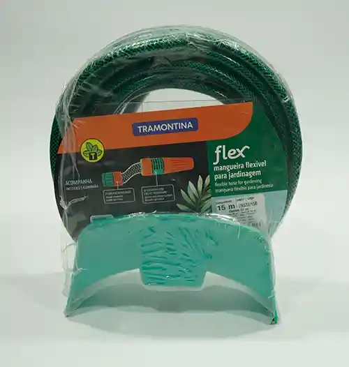 Manguera de 15 m de largo, fabricada con material resistente de alta flexibilidad. Recomendada para situaciones de uso con presión de agua hasta 10 bar [145 psi] y temperatura hasta 50 °C. Para mayor resistencia, tiene tres capas distintas: interna de PVC, intermedia de hilo poliéster trenzado y externa de PVC.