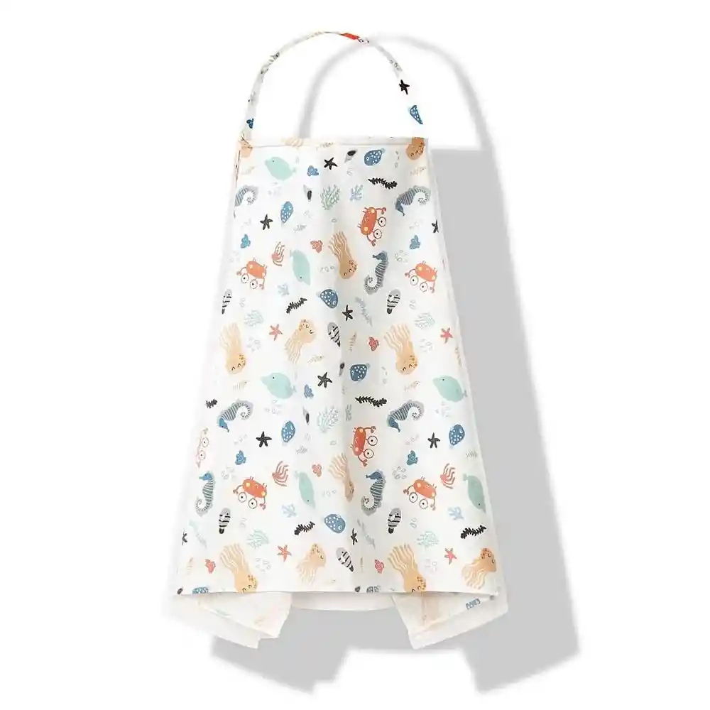 Material: Tela de algodón + Mosquitera Medida: 100 cm x 90 cm (aprox) Diseño: Animales Marinos Contiene: 01 Manta de Lactancia. En el cuello se puede ajustar en longitud según sus propias necesidades. El escote abierto rígido permite a la madre mantener el contacto visual con su bebe y el mismo garantiza la circulación del aire. También puedes utilizarla como manta para mantener a su bebé caliente Puedes aprovecharla como funda de asiento de cochecito Es multi uso pudiendo también usar como manta para el bebe, mosquitero de cochesito o para disminuir la iluminación en el mismo