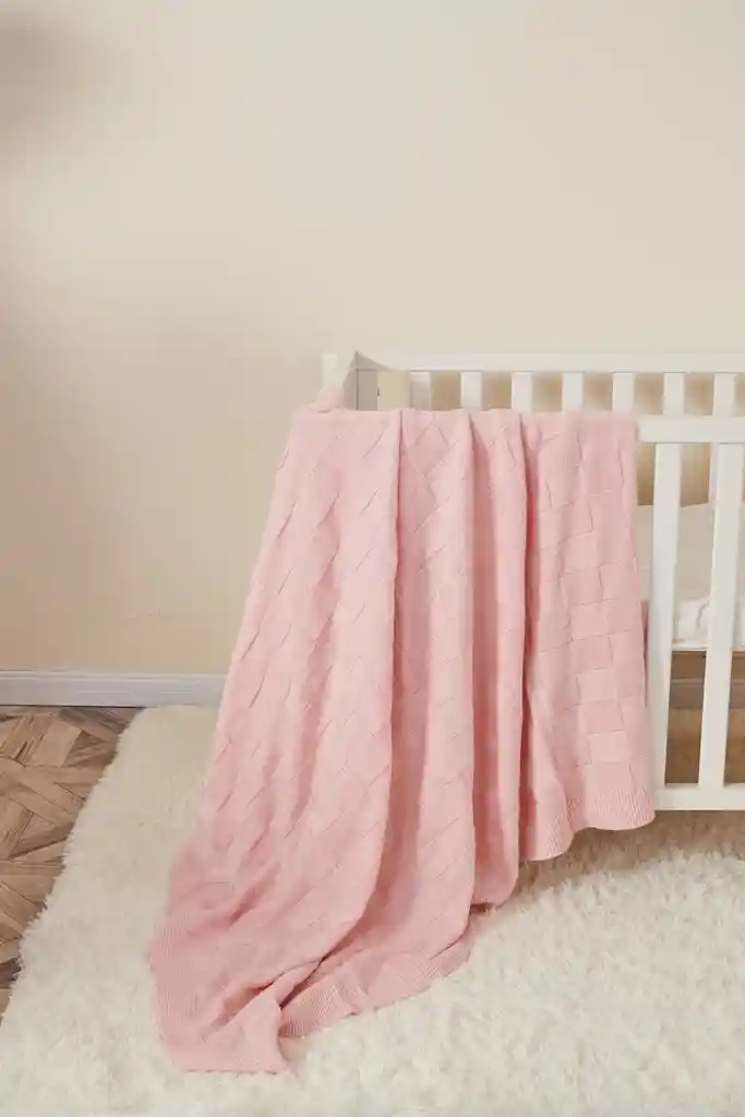 Manta tejida de lana, con un exquisito diseño a cuadros. Esta manta te acompañará desde el nacimiento de tu bebé, hasta cuando sea más grandecita. La manta tiene grandes dimensiones y es extremadamente suave. Mantendrá abierta a tu bebé siempre. Su suave color rosado le dará ese lindo toque femenino y delicado.