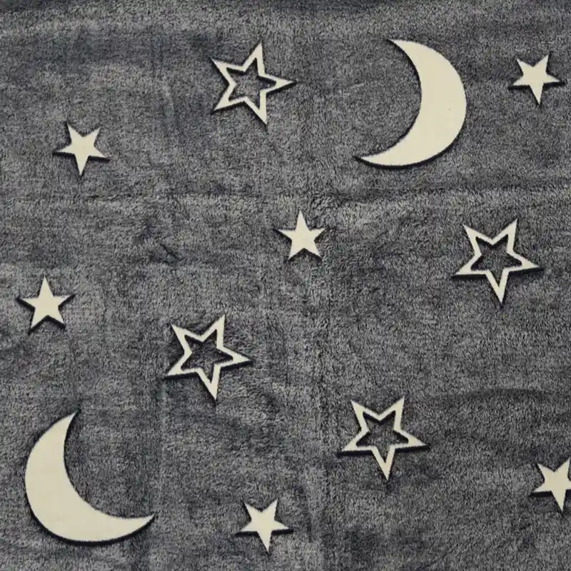 Fantástica manta mágica con lunas, sol y estrellas que ¡brillan en la oscuridad!; Es de felpa muy suave y confortable, es liviana, muy cómoda y mantiene el calor dando un merecido descanso. Es la opción perfecta para niños por su atractiva iluminación durante las noches. Instrucciones de lavado: Lavar a máquina por separado en ciclo suave con agua fría. Secar en secadora a baja temperatura hasta que se seque completamente o colgar preferiblemente. No es únicamente para niños, también puede ser de uso para adolescentes y adultos en viajes, camping, oficina o en el hogar.