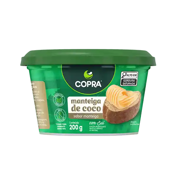 Ingredientes Aceite de coco (Cocos Nucifera L.), sal rosa del Himalaya, ácido cítrico y aroma similar a la mantequilla natural. Conservación En lugares con temperaturas superiores a 25ºC, mantener refrigerado para lograr una consistencia cremosa. En regiones más frías, por debajo de 25ºC, mantener en un lugar seco y protegido de la luz. Validez Una vez abierto, consumir dentro de los 30 días. Consejo importante Para reemplazar la mantequilla tradicional en panes, galletas, tostadas, tapioca, panqueques, crepes, yuca (yuca), batatas hervidas, etc.