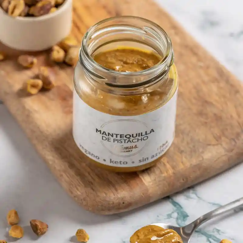 Olvídate de los ultra-procesados con nuestra Mantequilla de Pistachos 100% natural. ¡Sólo 2 ingredientes! Sin conservantes ni preservantes, para que puedas disfrutar de un sabor real, con ingredientes reales y de primera calidad Keto, baja en carbohidratos Vegana, sin ingredientes de origen animal Sin Azúcar, endulzada con Alulosa Ideal para acompañar recetas dulces y saladas, con el toque gourmet exquisito de los pistachos.
