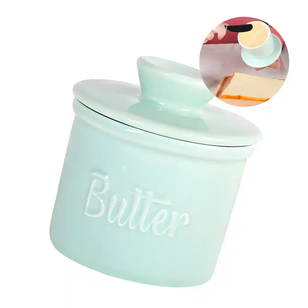 Mantequillera Francesa Blanco o Turquesa Este objeto está diseñado para conservar la mantequilla a temperatura ambiente, lo que permite que siempre esté suave y lista para untar. Este recipiente para mantequilla incluye un esparcidor de acero inoxidable. Hecho de porcelana de alta gama, el recipiente es resistente, duradero, libre de plomo y cadmio, además de ser fácil de limpiar. Tiene la capacidad suficiente para contener una barra de mantequilla ablandada. La vasija es muy fácil de utilizar. Primero, coloca la mantequilla suavizada en la tapa y presiónala contra los lados. Luego, añade agua fría en la base hasta la línea de llenado. El agua crea un sello hermético entre la tapa y la vasija, lo que mantiene la mantequilla fresca y en su punto para untar. Recomendaciones: Asegúrate de que la tapa esté completamente seca antes de usarla. La mantequilla demasiado blanda puede causar que se deslice al agua. Para mantener la mantequilla fresca, cambia el agua cada 2-3 días. Excelente valor de nuestra vajilla de mantequilla en cerámica turquesa. Es un regalo perfecto para ocasiones especiales como Acción de Gracias, Navidad o el Día de la Madre. Estamos seguros de que te encantará nuestra vajilla para mantequilla. Especificaciones: Capacidad: 135 ML Colores: Blanco / Turquesa Material: Porcelana Dimensiones: 11.5cm X 10 CM
