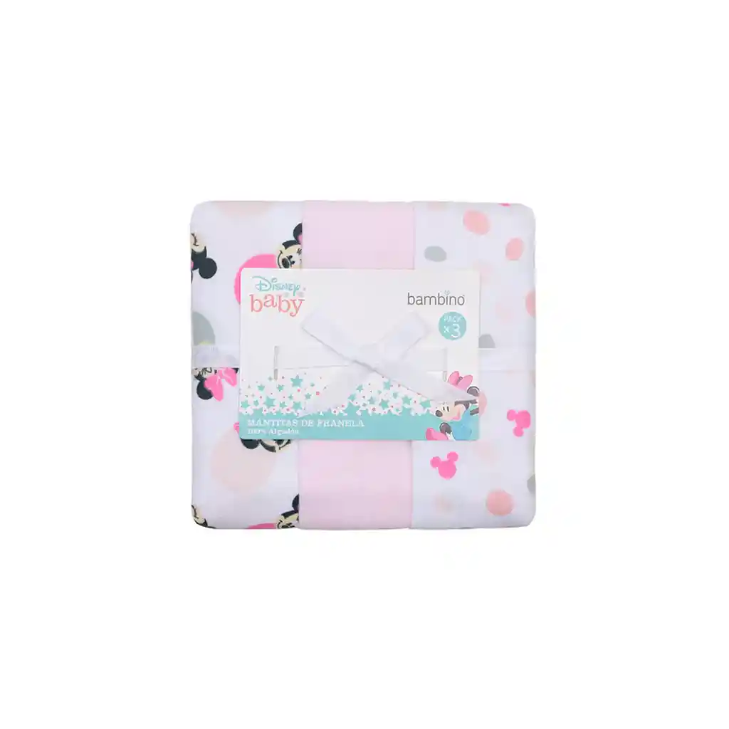 Características: - Mantitas de Franela 100% Algodón. - 76 cm x 76 cm. - Incluye 3 unidades. - Marca: Bambino. - Se recomienda lavar antes de usar. - Disney Baby.