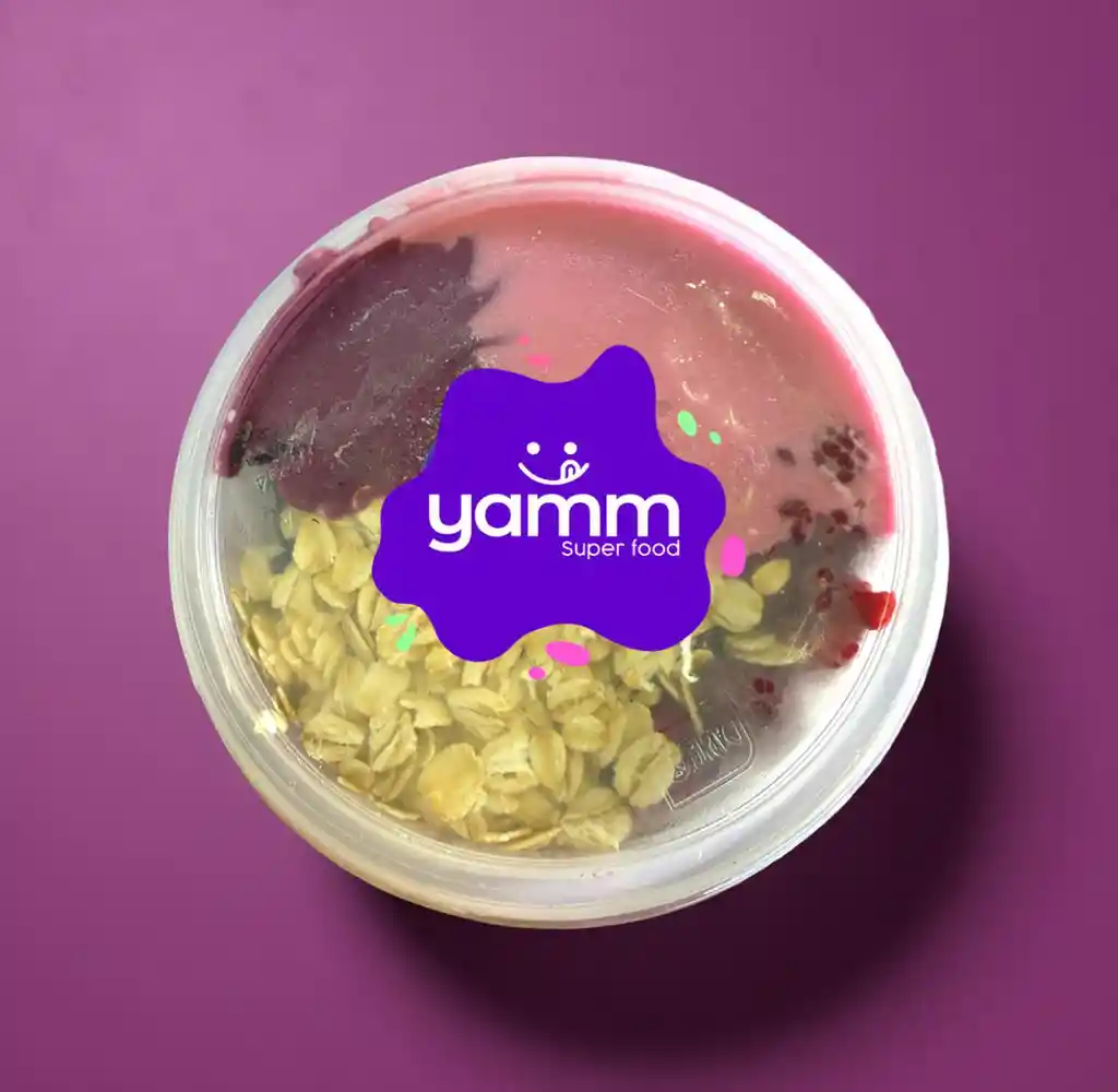 Base: sorbete de Maqui, sorbete de flor de Jamaica (hibiscus) agregado: avena integral, frambuesa, mora. Producto congelado Vegano