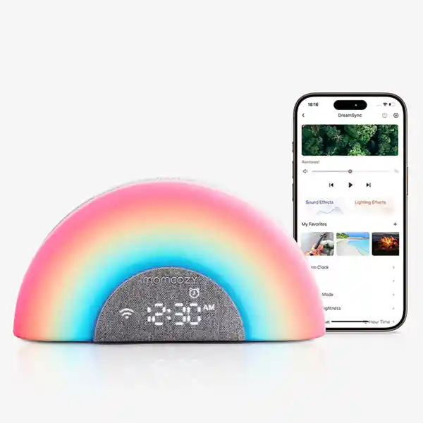 Máquina de sonido para bebés, luz nocturna, control de aplicación, constructor de rutina, máquina de ruido blanco con 34 sonidos relajantes, despertar luz amanecer, altavoz La máquina de ruido blanco para bebés cuenta con 34 sonidos de alta fidelidad, donde podrás elegir entre ruidos blancos, canciones de cuna o sonidos de naturaleza. Y una suave lámpara LED con luces en siete tonos distintos, que te acompañarán sin esfuerzo con la rutina del sueño de tu bebé. Puedes configurarla por teléfono o a través de su panel táctil, garantizando noches tranquilas y adaptadas a las necesidades de tu familia. Características: Calma a tu bebé más fácil y rápido: encuentra tu combinación mágica de 34 sonidos relajantes y 7 luces dinámicas inspiradas en la naturaleza, incluyendo una exclusiva luz arcoíris, y deja que ayude a tranquilizar a tu bebé. Crea un ambiente acogedor para dormir y silenciar el ruido de fondo con sonidos de la naturaleza, sonidos de ventilador, ruido blanco, tonos relajantes y volumen ajustable Construye hábitos de sueño saludables de por vida: establece el tiempo para la cama y el tiempo para levantarse para enseñar a los niños pequeños cuándo dormir y levantarse; transmite historias a la hora de acostarse con el altavoz inalámbrico y despiértalos suavemente con la alarma Sunrise y Tap to -Snooze Funciona muy bien solo, mejor con la aplicación: los botones de fácil acceso en el dispositivo ofrecen un control total de la luz y el sonido; controla de forma remota a través de WiFi y desbloquea más funciones con la aplicación Momcozy App, como colores de luz personalizados, alarmas, reloj infantil y temporizadores Características adicionales para los padres: incluye una luz nocturna regulable para alimentación nocturna y cambios de pañales, un reloj regulable para controles rápidos de la hora.