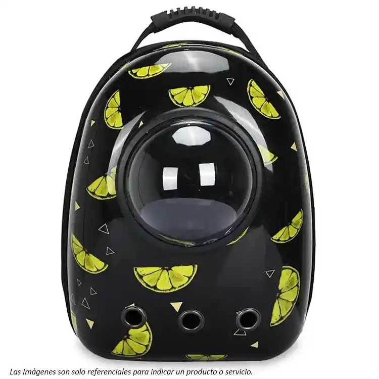 Mochila rígida para Perros y Gatos con diseño especial de Limones amarillos en color negro. Cuenta con una cúpula transparente para que puedan visualizar el viaje o bien utilizar la rejilla plástica incluída. Manilla superior, asas traseras para el transporte. Cuenta con una base semi acolchada para su comodidad. Cierre completo por todo el contorno de la mochila. Cuenta con ventilación lateral y frontal. Base exterior con gomas anti-deslizantes. Medidas: 34X28X42CM Peso máximo de aproximadamente 5 kilos.
