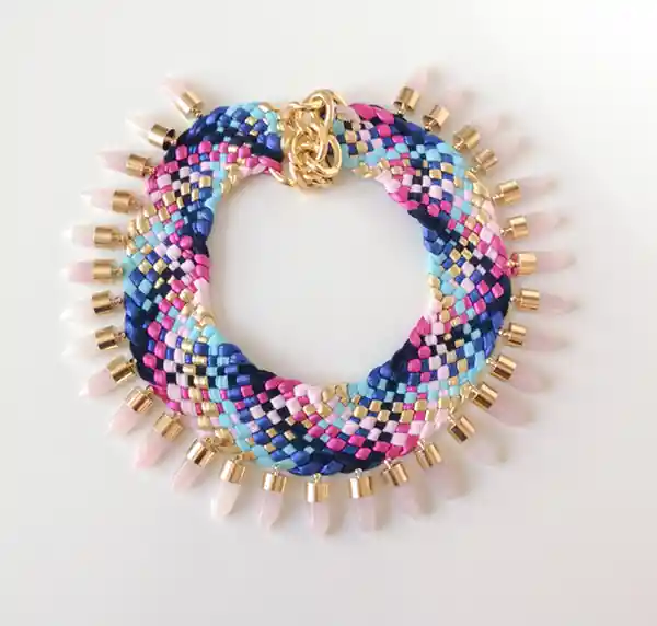 Collar Elasticado Color Fucsia. Azul Metálico. Rosado. Turquesa. Dorado y Negro Con Cuarzo Rosa de Casquetes Dorados. Tamaño 50 cm de Largo x 6 cm de Ancho. Cadena Dorada de Fantasía. Producto Lavable. Elastic Necklace. Colors Fuchsia Metallic- Blue Metallic- Pink- Turquoise- Gold- Black With Pink Quartz. Size 50 cm Length x 6.0 cm Width. Fantasy Golden Chain. Washable Product.