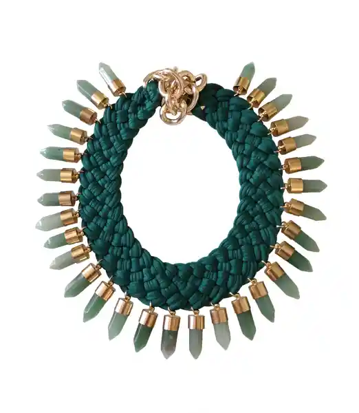Collar Elasticado Color Verde Piedra Venturina Con Casquetes Dorados. Cadena Dorada de Fantasía. Tamaño 50 cm de Largo x 6.0 cm de Ancho. Producto Lavable. Elastic Necklace. Colors Green Venturine Stone. Size 50 cm Length x 6.0 cm Width. Fantasy Golden Chain. Washable Product.
