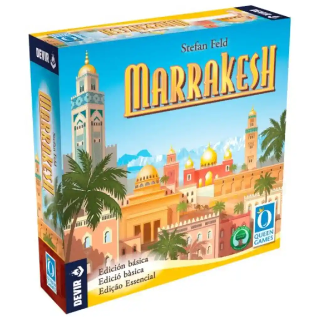 Marrakech se juega en tres rondas, y cada ronda consta de cuatro turnos. En cada turno, los jugadores eligen simultanea y secretamente tres cilindros de colores detras de su pantalla. Luego, en orden de turno, colocan asistentes del mismo color en su tablero de jugador (estas seran las acciones que realizaran mas adelante), luego todos los cilindros se colocan en la torre de cubos. La torre de cubos selecciona aleatoriamente que cilindros estan disponibles en esta ronda, algunos se atascan y otros de rondas anteriores salen. En orden de turno, los jugadores seleccionan un color y toman 1 o 2 de los cilindros que han pasado por la torre (o aquellos que se quedaron atascados en una ronda anterior pero que ahora han emergido) y los colocan en sus tableros de jugador. Estos cilindros mejoraran las acciones futuras realizadas con el mismo color en rondas futuras. Luego, por orden de turno, los jugadores activaran las regiones donde han colocado un asistente. Las acciones permiten a los jugadores ganar riqueza, que pueden canjear por influencia en la ciudad. Realizar varias acciones tambien otorga bonificaciones y mejora las acciones aun mas a medida que avanza el juego. Gana el jugador que consiga mas puntos al final del juego.