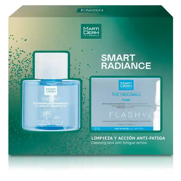 Pack Martiderm Contiene 2 Unidades. Solución Micelar Limpiadora 300 mL + Ampolla Anti Fatiga Iluminadora 5 Unidades de 2 mL c/u. Rutina Anti Fatiga.