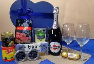 Cesta en elegante presentación: -Queso Importando -Aceitunas rellenas -Galletitas cocktel tika -2 Caviar Importandos -Tostadas -Papas fritas en lata -Salame Italiano -Bombones Ferrero Rocher de 37gramos -Martini botella 750 cc -2 Copas de espumante