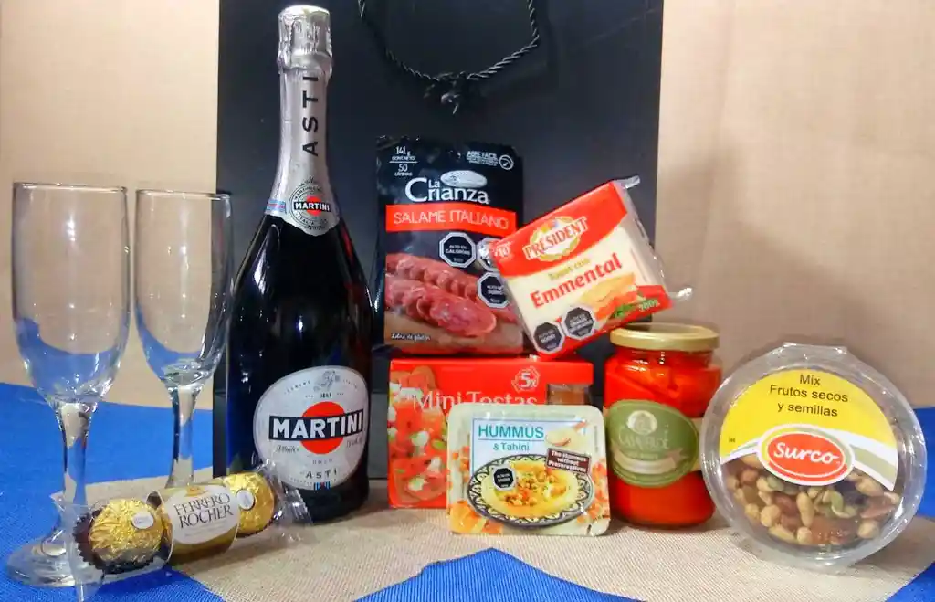 Cesta en elegante presentación: -Queso Frances Emmental -Hummus en Pasta -Salame Italiano -Pimentones Rojos -Mini Tostaditas -Mix Frutos Secos -Bombones Ferrero Rocher de 37Grs -Martini Botella 750cc - 2 Copas Espumante