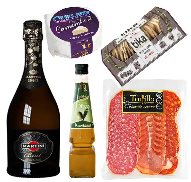 *Martini 750cc *Jamón Serrano *Papas Fritas Artesanales *Galletas Crackers Artesanales *Lata de Aceitunas