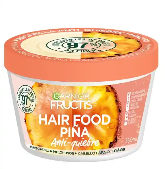 Repara e hidrata tu pelo con la Mascarilla Capilar de Garnier Fructis con extracto de piña. Cuenta con una fórmula adicionada con ingredientes y aceites esenciales que nutrirán tu cabello desde las puntas hasta la raíz. Puedes utilizarla como crema para peinar, acondicionador y hasta tratamiento para el cabello dañado, obteniendo resultados desde el primer uso. Atributos: Contenido: 350 ml Efecto anti-quiebre Nutrición intensiva Con ingredientes naturales Hidratación total para cabello seco Deja un efecto suave Agradable aroma Combate el daño capilar De uso diario