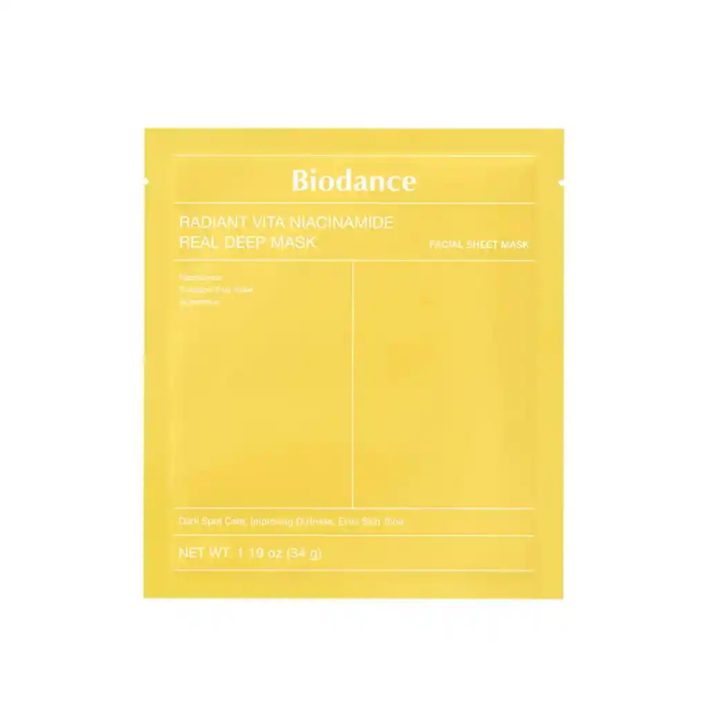 Si tienes la piel opaca y/o pigmentada, la Radiant Vita Niacinamide Reel Deep Mask de Biodance, es la mascarilla perfecta para ti. Con 2% de niacinamida, 10% de agua de piña, 99% de glutatión de alta pureza y 10 tipos de ácido hialurónico. Ayuda a mejorar tono, textura, luminosidad y a corregir manchitas no deseadas. Además, gracias al extracto de agua de piña y vitaminas, exfolia suavemente, para una piel más fresca y con un glow saludable. ¿Lo mejor? Es que es hipoalergénica y apta para piel sensible. Tamaño: 34 grs. Modo de uso Aplica la mascarilla en el final de tu rutina de cuidado y déjala por la noche o al menos por 3 a 4 horas para aprovechar todos sus beneficios. Ingredientes Ingredientes clave: Niacinamida, glutatión y extracto de agua de piña. Listado de ingredientes: Water, Ananas Sativus (Pineapple) Fruit Water(100,000ppm), Glycerin, Acrylates Copolymer, Niacinamide(20,000ppm), 1,2-Hexanediol, Ceratonia Siliqua (Carob) Gum, Betaine, Chondrus Crispus, Polyglyceryl-10 Laurate, Potassium Chloride, Sucrose, Polyglyceryl-2 Triisostearate, Allantoin, Agar, Cellulose Gum, Ethylhexylglycerin, Butylene Glycol, Adenosine, Pyrus Communis (Pear) Fruit Extract, Sclerotium Gum, Disodium EDTA, Rosa Damascena Flower Water, Melia Azadirachta Leaf Extract, Melia Azadirachta Flower Extract, Iris Florentina Root Extract, Ananas Sativus (Pineapple) Fruit Extract, Hippophae Rhamnoides Oil, Cucumis Melo (Melon) Fruit Extract, Curcuma Longa (Turmeric) Root Extract, Hedera Helix (Ivy) Leaf/Stem Extract, Ocimum Sanctum Leaf Extract, Corallina Officinalis Extract, Tocopherol, Sodium Hyaluronate, Hydrolyzed Hyaluronic Acid, Gluconolactone, Boron Nitride, Caprylyl Glycol, Hydroxypropyltrimonium Hyaluronate, Glutathione, Sodium Acetylated Hyaluronate, Hyaluronic Acid, Hydrolyzed Sodium Hyaluronate, Sodium Hyaluronate Crosspolymer, Potassium Hyaluronate.