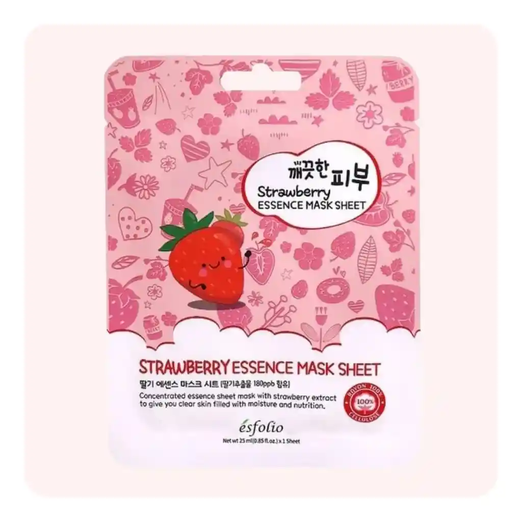 Mascarilla facial ideal para aquellos que quieren lucir una piel hidratada, nutrida y luminosa! Con extracto de distintos berries que ayudan a desintoxicar la piel, iluminarla y mejorar el tono. Con una concentración alta y una variedad de ingredientes nutritivos, la Esfolio Strawberry Essence Mask brindará tanto hidratación como humectación, que aporta a tu piel vitalidad y evita que pierdas agua. Utilice en rostro limpio y tonificado. Abra el empaque con cuidado, saque la mascarilla, ajústela en ojos y nariz y luego extienda uniformemente para que se adhiera a todo el rostro. Deje actuar por aproximadamente 15 a 20 minutos y retire sin enjuagar, no reutilice. Masajee ligeramente la esencia restante en la piel hasta su absorción. Uso recomendado de tres veces por semana.