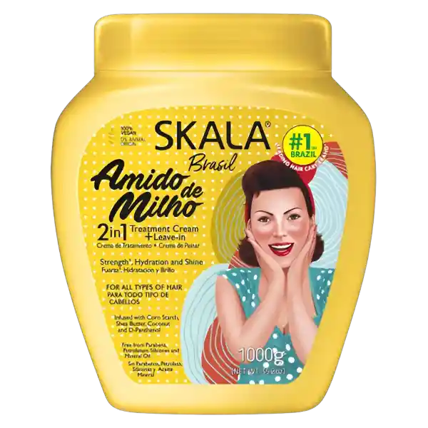 La Mascarilla Skala Amido de Milho 1000 gr es un tratamiento capilar intensivo que combina el poder del almidón de maíz, manteca de karité, aceite de coco y D-Pantenol, ideal para cabellos secos, encrespados o dañados. Su fórmula ayuda a hidratar profundamente, reducir el frizz, aportar suavidad y facilitar el peinado, dejando el cabello más fuerte, brillante y disciplinado. Características destacadas: Hidratación profunda: nutre el cabello desde la raíz hasta las puntas. Reparación y fuerza: fortalece la fibra capilar y reduce la fragilidad. Control del frizz: aporta suavidad y brillo natural. Libre de sulfatos, parabenos y siliconas: apta para rutinas capilares conscientes. Vegana y no testeada en animales. Forma de uso recomendada: Como mascarilla de tratamiento: Aplica generosamente sobre el cabello limpio y húmedo. Masajea mechón por mechón, evitando las raíces. Deja actuar 15 minutos para una hidratación profunda. Para mejores resultados, utiliza un gorro térmico. Enjuaga con abundante agua tibia. Como crema de peinar (sin enjuague): Aplica una pequeña cantidad sobre el cabello húmedo o seco. Distribuye uniformemente de medios a puntas. Peina como de costumbre.