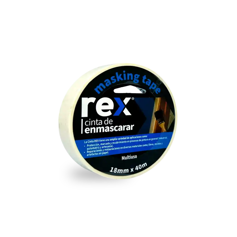 Masking Tape 18mm – Rex Rex Cinta Masking Tape es ideal para múltiples aplicaciones de protección y fijación. Usos recomendados: Protección, marcado y recubrimiento en procesos de pintura (industrial, automotriz y artesanía) Enmiendas y reparaciones en restauraciones de libros, revistas y artículos de papel Trabajos generales en hogar, oficina y taller Se adhiere fácilmente, permite trazos definidos y es práctica para trabajos que requieren precisión y limpieza.
