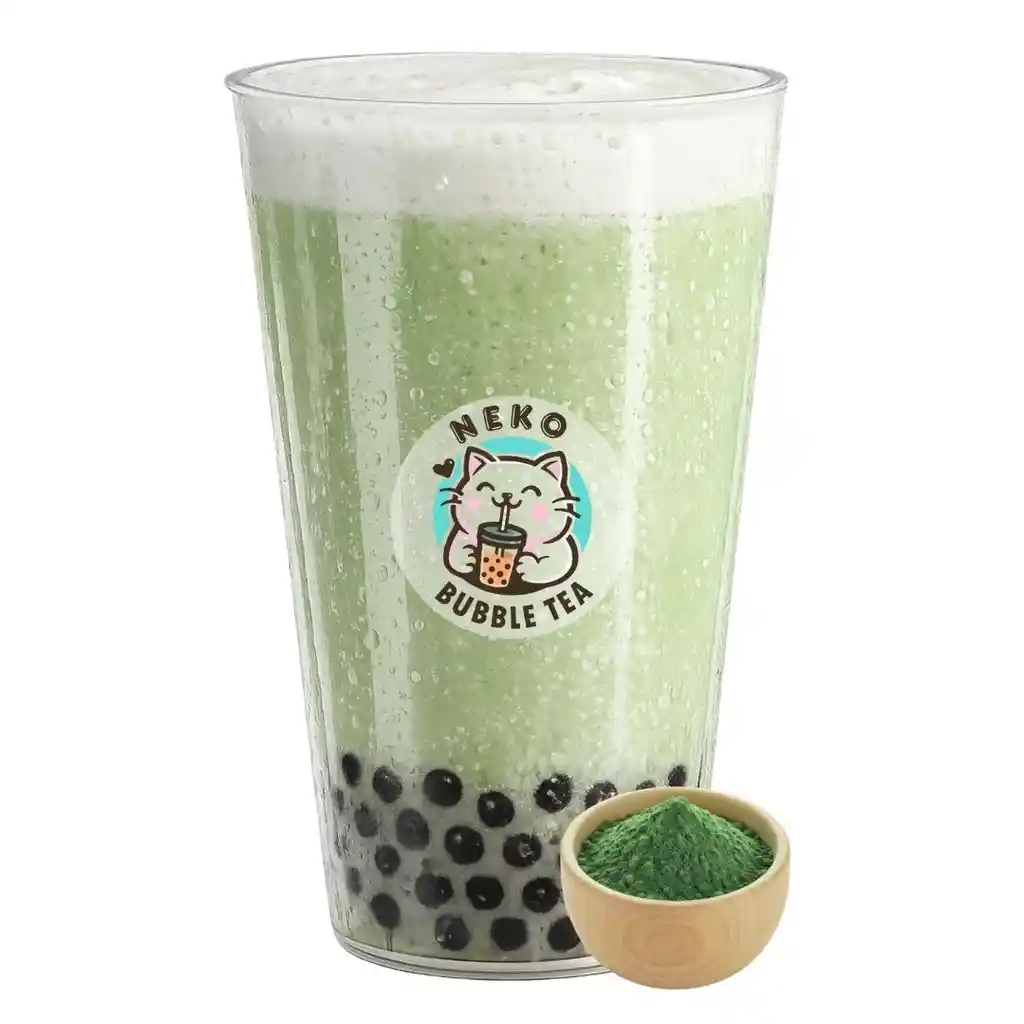 Matcha con leche entera natural, hielo y tapioca.