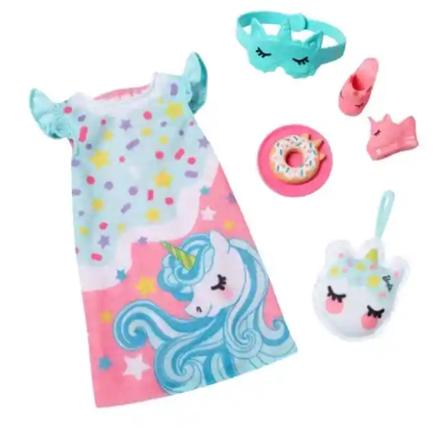 Bienvenida al adorable mundo de Mi Primera Barbie en el que las pequeñas juegan, aprenden y crecen con Barbie® y sus amigos. Inspira dulce sueños con este pack de moda y accesorios seleccionado. La muñeca Mi Primera Barbie (no incluida) está lista para dormir con su camisón con detalles de unicornio rosa y azul. (Ropa compatible con las muñecas Mi Primera Barbie de 34,29 cm). También se incluyen accesorios de gran tamaño inspirados en un unicornio, tales como un antifaz para los ojos, una dona glaseada, un par de pantuflas peludas y un peluche de unicornio con una pulsera que se enrolla alrededor de las manos de la muñeca. Los cierres de la ropa son sencillos, lo que facilita el juego de vestir a las manos más pequeñas y también puede ayudar a desarrollar la destreza. Los niños pueden coleccionar otros packs de moda de Mi Primera Barbie para ser creativos y mezclar los atuendos y explorar una gran variedad de historias. (Se venden por separado y están sujetos a disponibilidad). Se recomienda de 3 años en adelante.