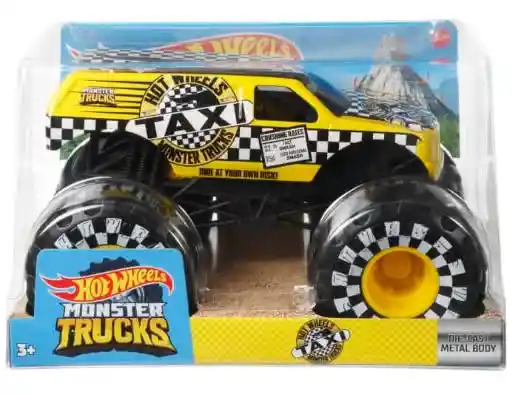 Los camiones fundidos a presión a escala 1:24 de Hot Wheels Monster Trucks son camiones construidos para la competencia y el dominio definitivo. Los escandalosos vehículos están listos para enfrentarse en batallas cara a cara con un cuerpo de gran tamaño y ruedas gigantes. Cada paquete de camión de juguete incluye estadísticas divertidas para el camión monstruo que está adentro, incluido el nombre, el tipo de camión, la fuerza, el ataque de choque único y el motor-vation para una gran diversión al contar historias! Cada uno se vende por separado, sujeto a disponibilidad. Los colores y las decoraciones pueden variar. Las ruedas gigantes y los detalles geniales amplifican el juego de acrobacias de recolección y choque. Es un gran regalo para niños y fanáticos de Monster Trucks de 3 años en adelante! Dimensiones: 14L x 19D x 12H cm