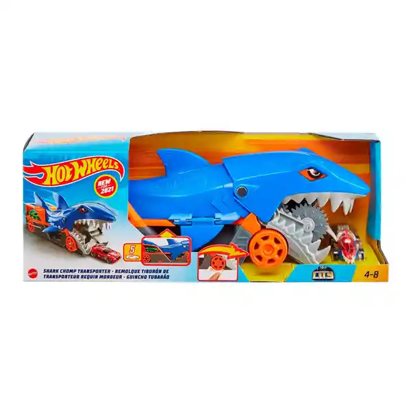 Este increíble camión inspirado en un tiburón recoge los coches y los almacena en su estómago, una manera única y divertida de transportar y almacenar los vehículos de Hot Wheels. Esta versión más grande del icónico Shark Bite de Hot Wheels tiene las características más reconocibles de uno de los enemigos favoritos de los niños, una rampa de salida en la parte trasera que impulsa los coches hacia su próxima aventura. El Remolque de tiburón de transporte de Hot Wheels incluye un coche Shark Bite de Hot Wheels y puede albergar hasta cuatro más. (Los vehículos adicionales se venden por separado). A los niños les encantará el tiburón que se traga los coches, mientras que los padres disfrutarán del cómodo y discreto espacio de almacenamiento que proporciona cuando no se utiliza. Se recomienda de 4 años en adelante.