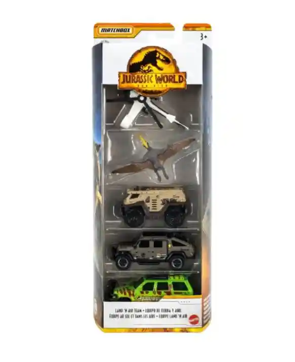 Los vehículos fundidos a presión de Matchbox Jurassic World están llenos de emoción y aventura. Cada vehículo fundido a escala aproximadamente 1:64 tiene detalles intrincados y una decoración auténtica inspirada en el mundo Jurassic World, incluido el nuevo Jurassic World Dominion. Desde camiones hasta transportadores y otros, cada vehículo crea una oportunidad para contar historias y es un regalo divertido y lleno de acción para los fanáticos de Jurassic World de 3 años en adelante. Cada vehículo mide entre 6 y 7 cm. de largo aproximadamente El paquete de 5 equipos Land 'N Air contiene 4 vehículos y 1 dinosaurio: Helicóptero de rescate rápido, Pteranodon, Camión MBX Capture Action (con decoración exclusiva), Jeep Gladiator '19 (con decoración exclusiva), '93 Ford Explorador #4. Se recomienda de 3 años en adelante.