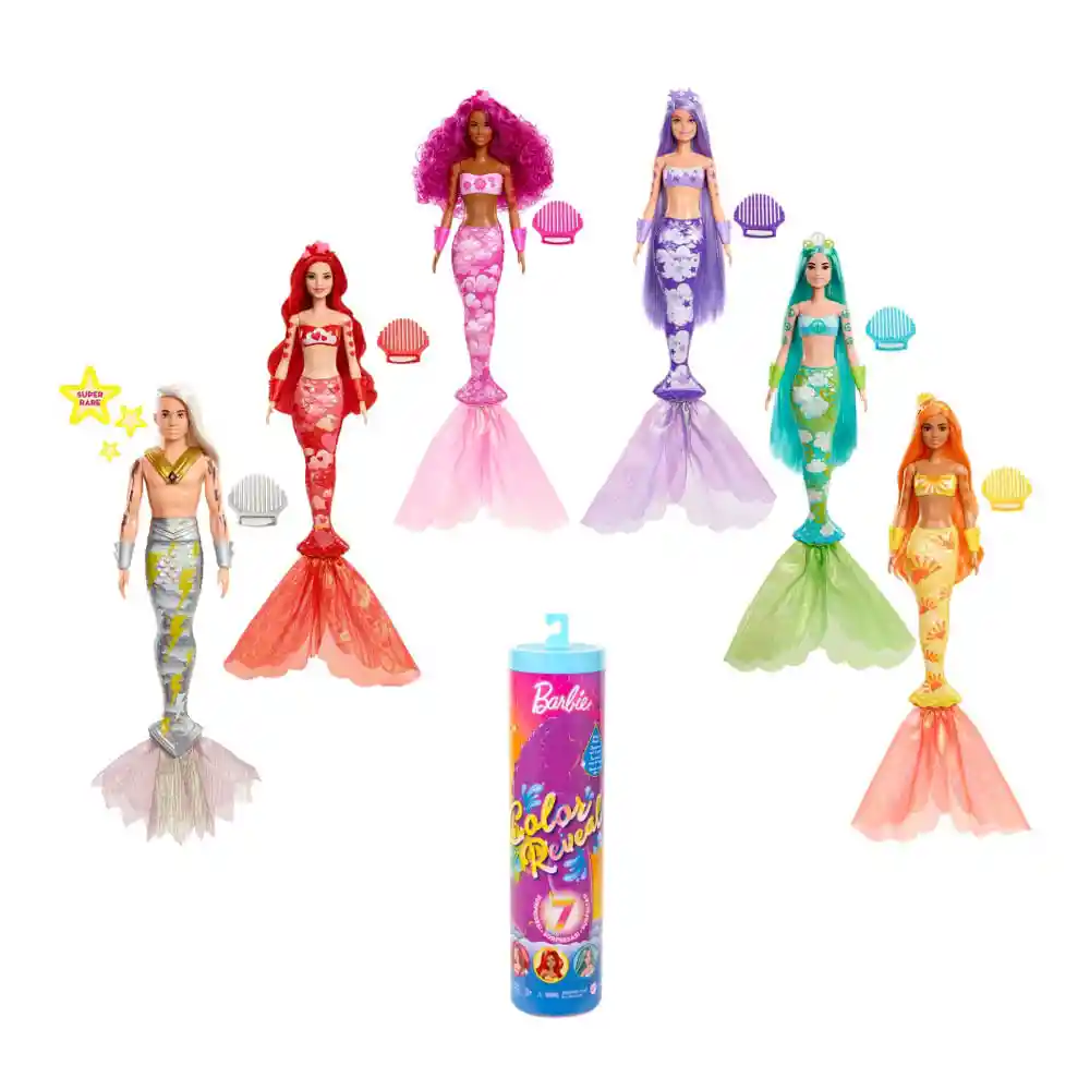Las muñecas Barbie Color Reveal, brindan una increíble experiencia llena de sorpresas, cuando la apariencia de cada muñeca es un misterio a resolver. El envase tiene adentro una muñeca misteriosa de color verde azulado y cuatro bolsas con accesorios sorpresas, como una cola de sirena, un collar, un cepillo y una esponja. Para revelar la apariencia de la Barbie, debes llenar el tubo con agua tibia (esto debes hacerlo con ayuda de un adulto) y sumergir la muñeca dentro y moverla muy suavemente y se revelará una hermosa sirena. Cada una tiene una combinación distinta de color de ojos, color de cabello, tono de piel y corsé decorado. Son 7 modelos diferentes. Cada uno se vende por separado. Se recomienda de 3 años en adelante.