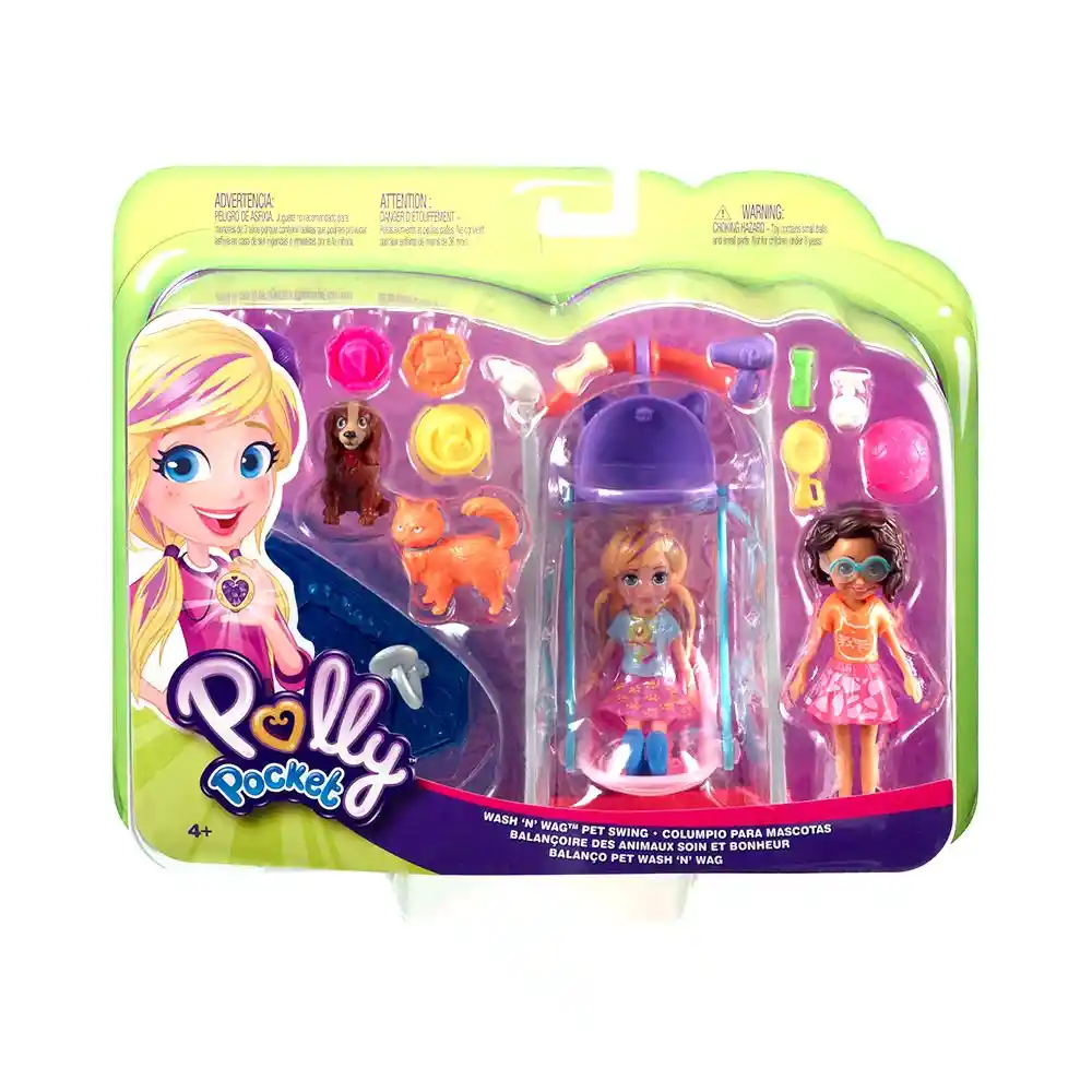 Polly™ y Shani™ están listas para divertirse en los columpios con sus mascotas! El set de juego del columpio de mascotas Hora de Juego con Mascotas™ incluye un lindo columpio doble de color rosa y púrpura para que las mascotas se diviertan. Polly™ puede columpiar a su perrito Peaches, y Shani™ a su gatito Capitán Cobblywobbles al mismo tiempo. También viene con una bañera para que las mascotas jueguen y, luego, se den un chapuzón. Cuando hayan terminado, las niñas pueden “secarles” el cabello a sus mascotas. El set de juego incluye las muñecas Polly™ y Shani™ de 8 cm, Peaches, Capitán Cobblywobbles, una pelota, un plato de comida, premios, un disco volador, un ratón de juguete, champú, un cepillo y un secador de cabello. Se recomienda de 4 años en adelante.