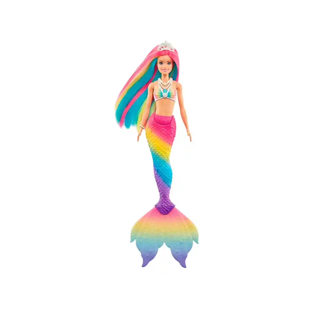 Descubre el mágico mundo de tu muñeca favorita, junto a esta preciosa y sorprendente muñeca Barbie Dreamtopia Sirena Arcoíris Mágico. Hazte con esta colorida y genial muñeca Barbie Dreamtopia que pude cambiar de color, solo has de utilizar agua fría o agua caliente, para disfrutar de un estilo diferente de una misma muñeca. La muñeca tiene brazos, cabeza y cola articulada, justo lo que buscas para poder desarrollar infinidad de nuevas aventuras bajo el agua. Con accesorios de princesa para y una combinación de colores mágica. Incluye: Muñeca Barbie Dreamtopia que cambia de color, 1 collar blanco para la muñeca y 1 diadema blanca para la muñeca. Medidas aproximadas de la muñeca: 38 cm de alto, 10 cm de ancho y 3 cm de fondo. Medidas aproximadas de la diadema: 2 cm de alto, 3 cm de ancho y 3 cm de fondo. Se recomienda de 3 años en adelante.