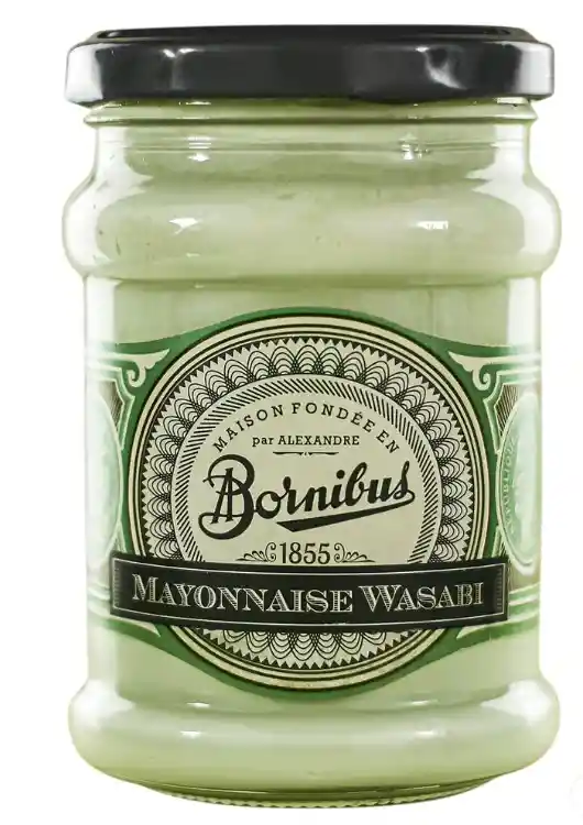 Mayonesa con Wasabi Bornibus 220 g Atrévete a darle un toque gourmet y picante a tus platos con esta mayonesa francesa infusionada con wasabi. Cremosa, intensa y perfectamente equilibrada, es ideal para sushi, sándwiches, carnes frías o picoteos.