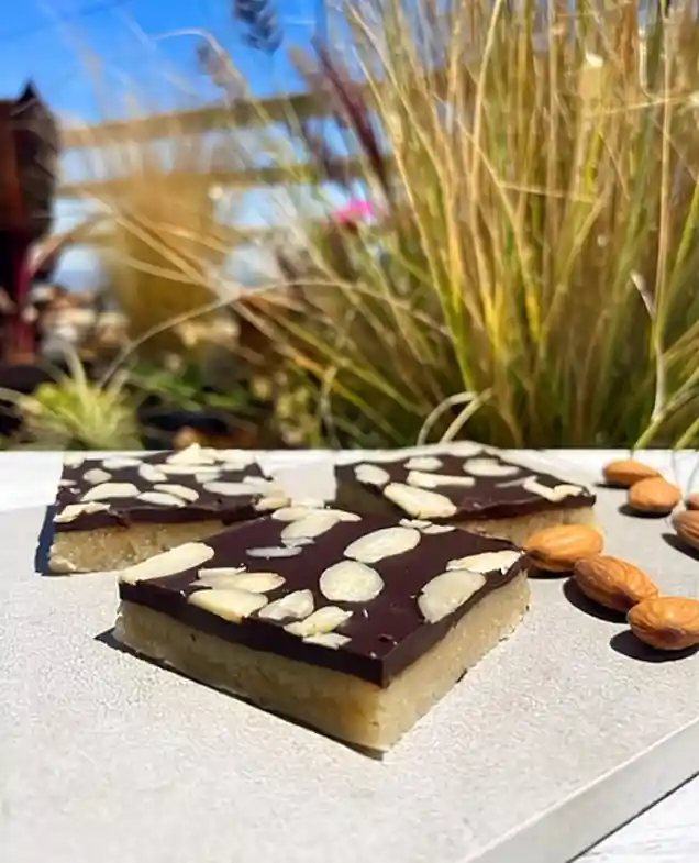 Masa de almendras, endulzada con alulosa, cubierta de chocolate bitter y topping de almendras laminadas.*sin azúcar *sin harinas *sin lácteos. 1pz.