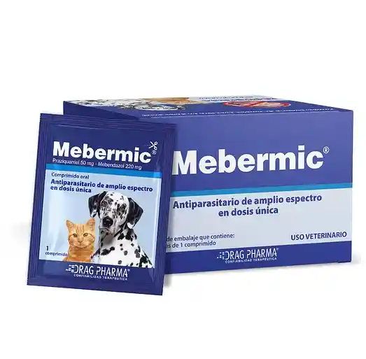 COMPOSICIÓN Cada comprimido contiene: Praziquantel..........................50 mg Mebendazol.........................220 mg Excipientes c.s.p...........1 comprimido INDICACIONES Tratamiento de todas las parasitosis internas (Nematodos y Cestodos) de perros y gatos (excepto Trichuris vulpis). VÍA DE ADMINISTRACIÓN Y DOSIS Administración oral. Dosis: 1 comp/10 Kg de peso corporal, en dosis única (equivalente a 5 mg/Kg de Praziquantel y 22 mg/Kg de Mebendazol). INTERACCIONES MEDICAMENTOSAS No utilizar en forma concomitante con otros productos farmacéuticos. CONTRAINDICACIONES No administrar en perros menores de 4 semanas de edad, ni en gatos menores de 6 semanas de edad. No usar en animales con alteraciones de la función hepática, renal o cardíaca. No administrar durante la preñez o en período de lactancia ADVERTENCIAS Mantener fuera del alcance de los niños.