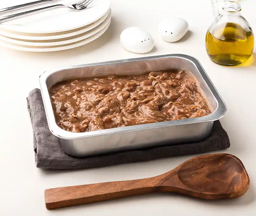 Carne de vacuno cocinada 8 hrs desmechada y acompañada con su salsa, especial para preparar sandwich ó acompañarla con alguna guarnicion para preparar tú plato de fondo.