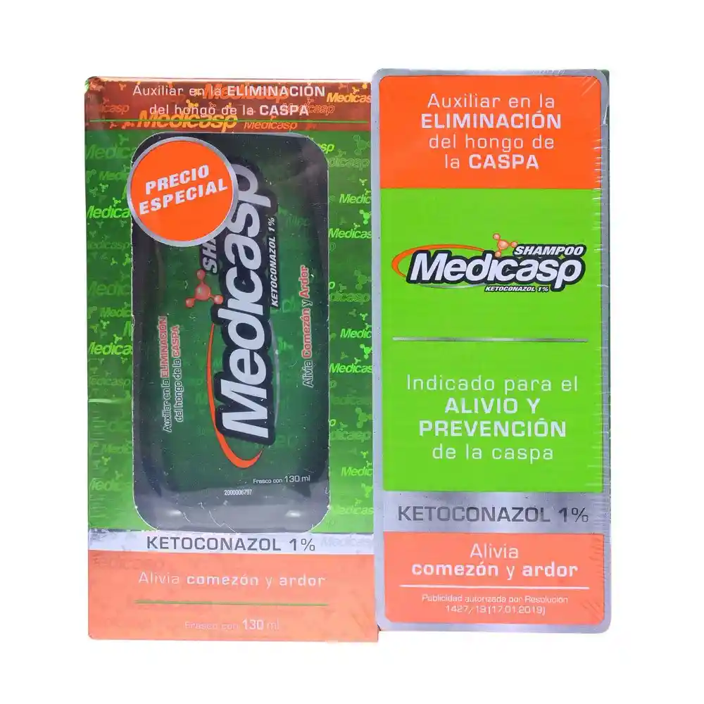 Principio Activo: Ketoconazol / Forma Farmacéutica: Shampoo / Dosis Por Forma Farmacéutica: 1%. ¿Para Qué Enfermedades o Condiciones se Prescribe Este Medicamento? Indicado Para el Alivio y Prevención de la Caspa (Pitiarisis Capitis), Ocasionada Por P. Ovalle (Malassezia Furfur) ya Que su Acción Ayuda a Evitar Molestias Como Cabello Quebradizo, Débil, Opaco y Con Puntos Blancos, Así Como Irritación, Enrojecimiento, Comezón y Ardor en el Cuero Cabelludo. ¿Cómo Debo Usar Este Producto? (Posología) Medicasp Por lo General se Aplica 1 Vez al Día Durante 2 a 6 Semanas. Por lo General se Aplica 1 Vez Para Tratar la Infección. Presentación Medicasp Viene en Formato de Shampoo, el Envase Contiene 130 mL. Condiciones de Almacenamiento Almacenar a no Más de 25°C. Mantener en un Lugar Fresco y Seco. Mantener Alejado de Los Niños. Principio Activo (Nombre Genérico) Ketoconazol. Advertencias de Uso Medicasp Viene Envasado en Forma de Crema y Champú Para Aplicar Sobre la Piel. El Ketoconazol Sin Prescripción Viene Envasado en Forma de Champú Para Aplicar al Cuero Cabelludo. Medicasp Por lo General se Aplica 1 Vez al Día Durante 2 a 6 Semanas. Por lo General se Aplica 1 Vez Para Tratar la Infección. Generalmente se Usa Cada Días 3 a 4 Por Hasta 8 Semanas y Luego se Usa Según Sea Necesario Para Controlar la Caspa. Use el Medicamento Exactamente Como se Indica. No Use Más ni Menos Que la Dosis Indicada ni Tampoco Más Seguido Que lo Prescrito Por su Médico. Dosificación la Concentración de Ketoconazol es de 1%. Reacciones Adversas Sensación de Quemazón, Eritema, Picor. Contraindicaciones Hipersensibilidad a Ketoconazol, a Cualquier Otro Antimicótico Del Grupo de Los Imidazoles. Condición de Venta Venta Libre.