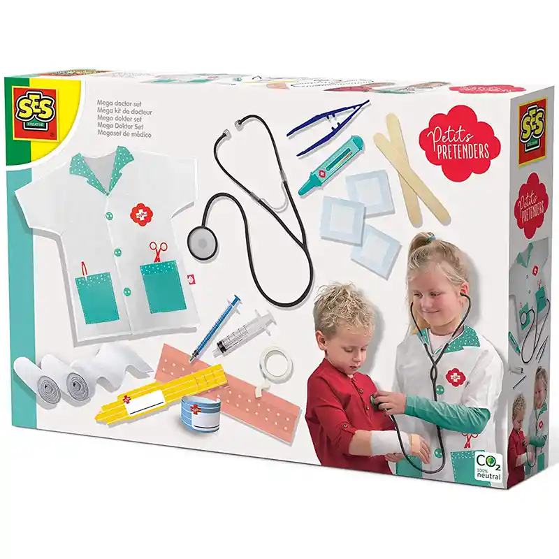 Edad: 3 años + Póngase la bata de médico, porque hay varios pacientes haciendo cola en el consultorio de su médico a los que les gustaría recibir ayuda. ¿Les ayudarás? Por ejemplo, puede escuchar los latidos del corazón del paciente con un estetoscopio real, vendar una herida con una gasa o medir la temperatura con el termómetro de juego. Si el paciente tiene que quedarse un poco más, puede ponerse una muñequera y llevarlo a una cama de hospital. Este set de la colección Petits pretenders de SES contiene todo lo que necesitas para sumergirte en el mundo de los médicos y hospitales. Fabricado en Holanda. Contenido: Bata de médico, estetoscopio de trabajo, termómetro de juego, tiritas, 2 jeringas, 3 parches, 2 rollos de malla de vendaje, rollo de cinta de vendaje, pinzas de plástico, 2 depresores de lengua y 2 muñequeras de paciente.