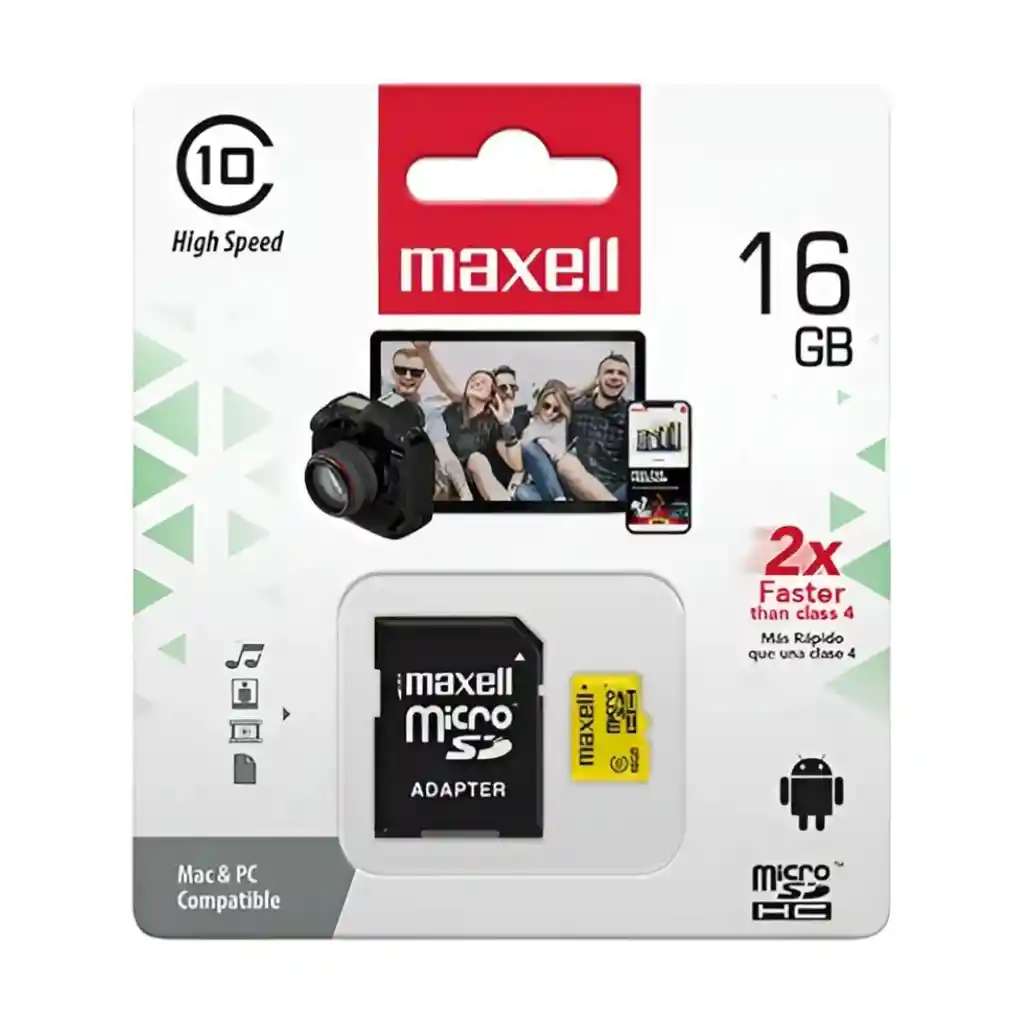 Memoria MicroSD Maxell de 16GB Clase 10, ideal para celulares, cámaras, tablets y otros dispositivos compatibles. Ofrece buena velocidad para grabación de video y almacenamiento de fotos, música y aplicaciones. Confiable y práctica para ampliar la capacidad de tu equipo en el día a día. 💾📱