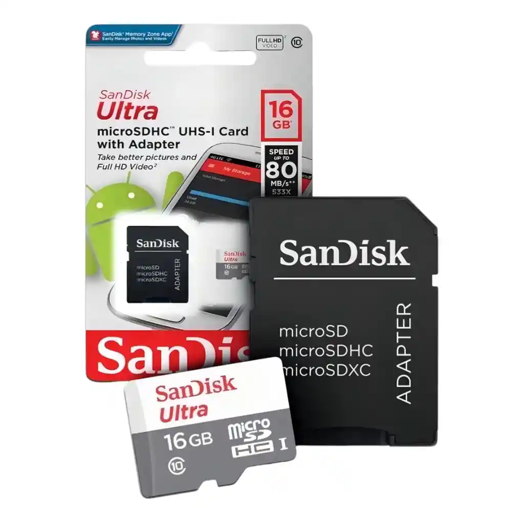 Memoria SD SanDisk de 16GB ideal para cámaras digitales, notebooks y otros dispositivos compatibles. Ofrece buena velocidad de lectura y escritura para fotos, videos y archivos. Diseño resistente y confiable, perfecta para uso diario y almacenamiento seguro. 📷💾