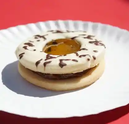 Mendocino artesanal con suave masa mantecosa, relleno de maracuyá y cubierto con glasé blanco, decorado con hilos de chocolate.