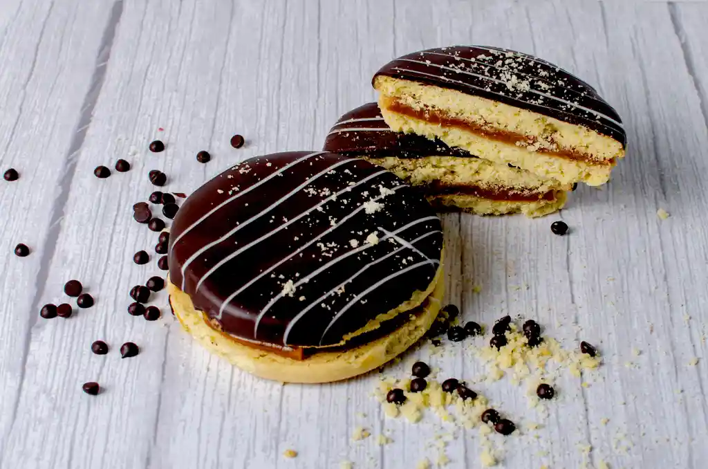 Masa de galleta rellena de manjar y cubierta de chocolate