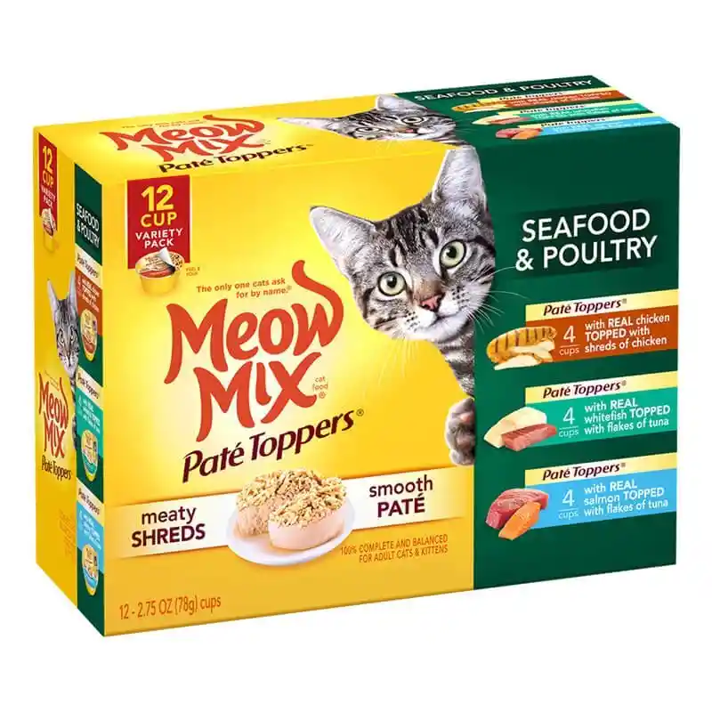 Meow Mix Pollo, Pescado y Salmón es un delicioso pack que contiene tres sabores únicos de alimento húmedo que a tu gato le encantará. Cada pote es una combinación con trozos pequeños de mariscos o pollo sobre un paté suave para que cada comida sea irresistiblemente nutritiva y deliciosa. Con ingredientes saludables y sabores sabrosos, ¡no es de extrañar que los gatos lo pidan por su nombre!